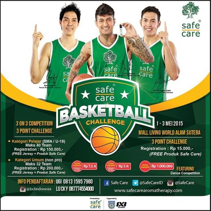 Setelah sukses diadakan di kota Batam, Solo, Bandung dan Surabaya. Kali ini Safe Care Basketball Challenge hadir di Ibukota JAKARTA! So, buat kamu yang punya skill basket, itu kudu wajib musti ikutan event ini. Nih di event ini kamu bisa daftarkan diri kamu dan tim kamu untuk ikutan 3×3 basketball yang seru dan 3 point challenge yang gak kalah seru.
