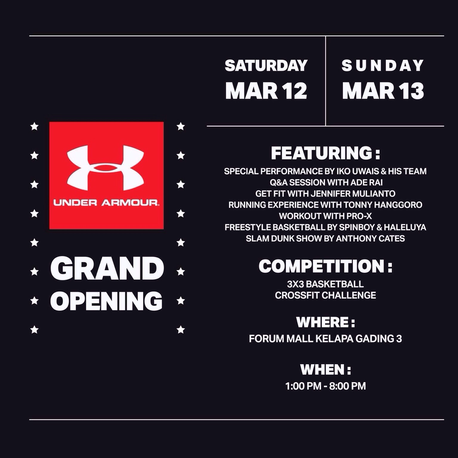 Ballers Jakarta minggu ini dihebohkan dengan Grand Launching Sepatu terkemuka Under Armour, Tak diragukan lagi Brand yang sudah diakui kualitasnya ini membuka toko resmi pertamanya di Indonesia. Bertempat di Mall Kelapa Gading 2.